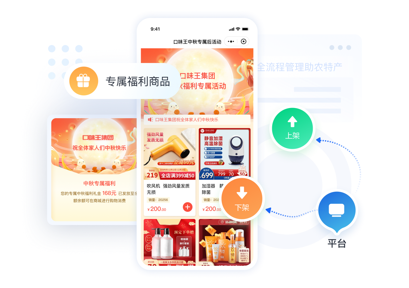 - 全流程管理助农特产等福利商品,支持专属定制与灵活上下架操作。