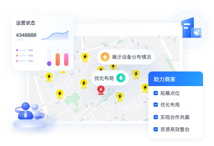 - 为合作商家提供一站式入驻流程与数字化管理支持。系统清晰展示商家旗下设备的分布与运营状况,助力商家拓展点位、优化布局,实现合作共赢与资源高效整合。