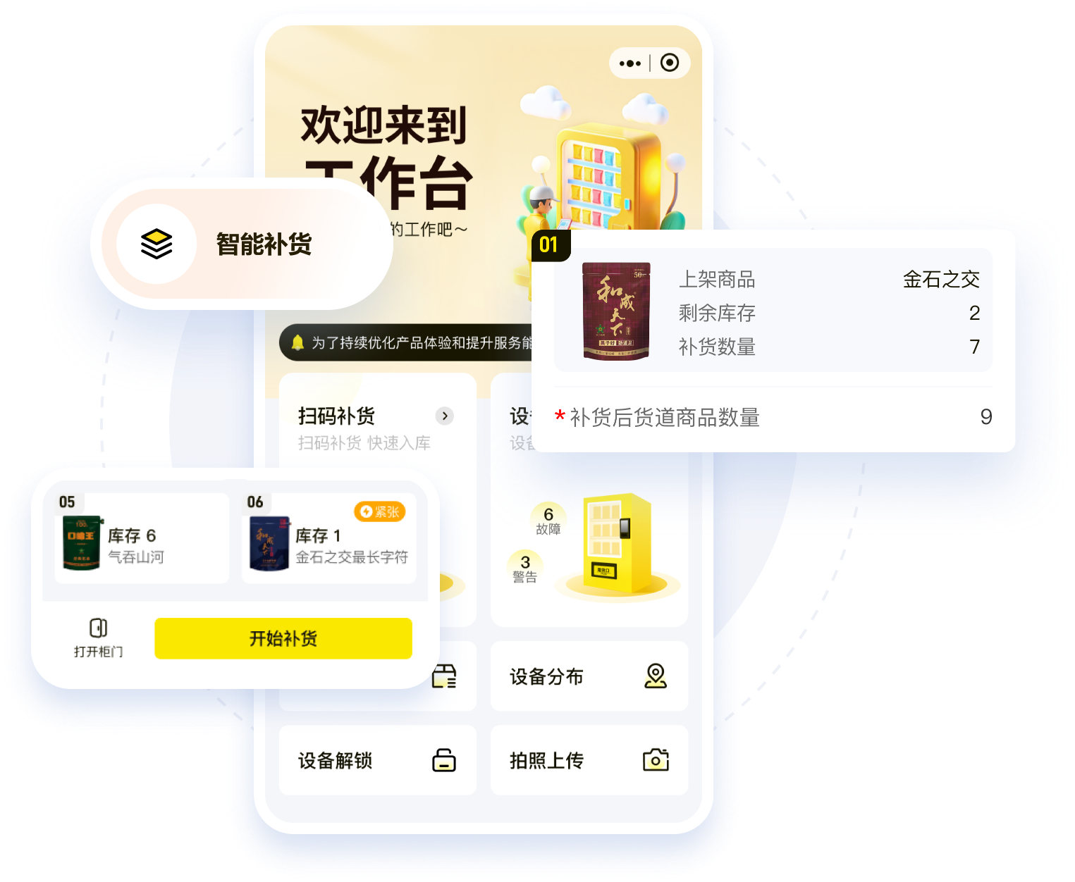 - 补货员通过专属小程序扫码识别设备,系统自动展示待补商品、补货数量