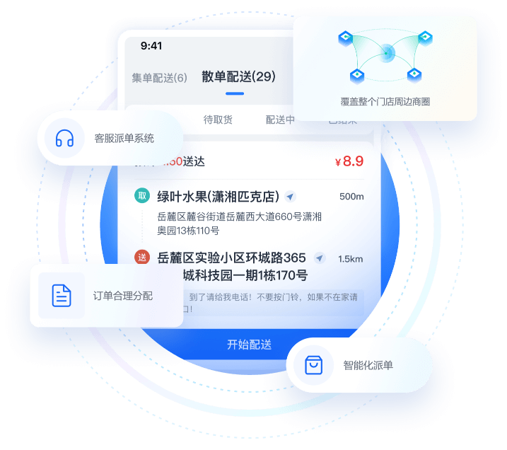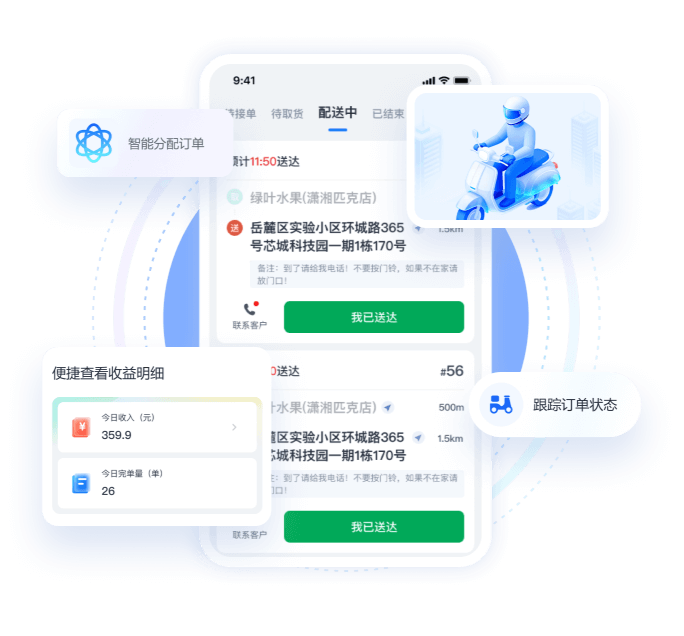 - 应用于高校外卖跑腿、商家自配、区域承包配送、卖家收银等场景