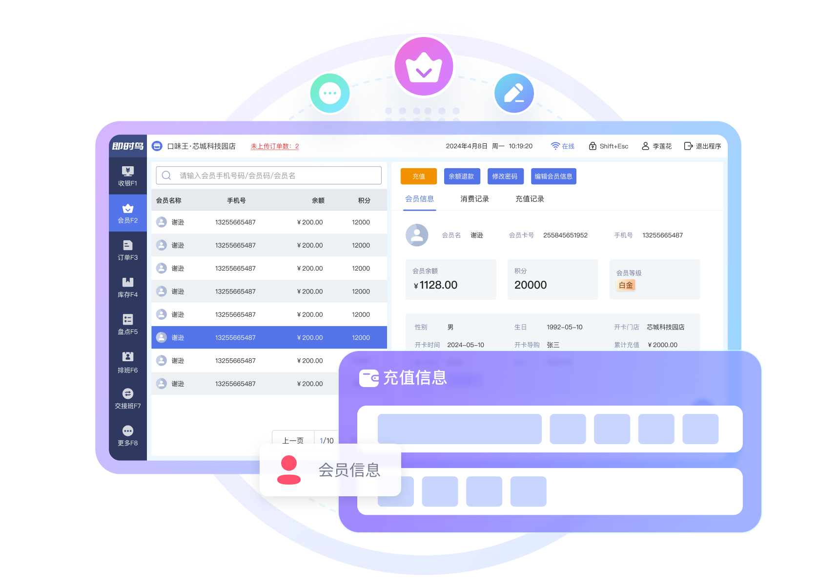 - 支持设置不同的充值规则模板,对会员进行充值操作