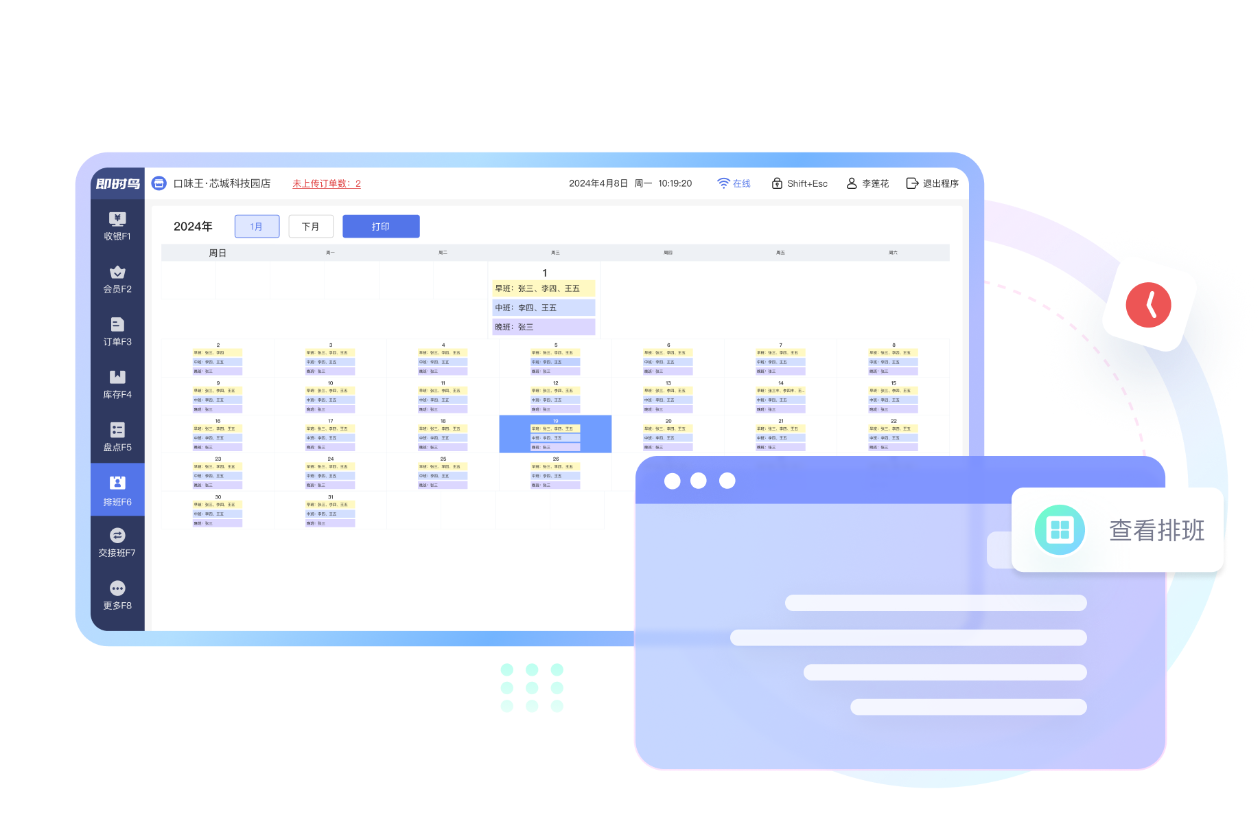- 根据门店营业时间、业务量等因素,制定排班规则。交班时生成交班记录